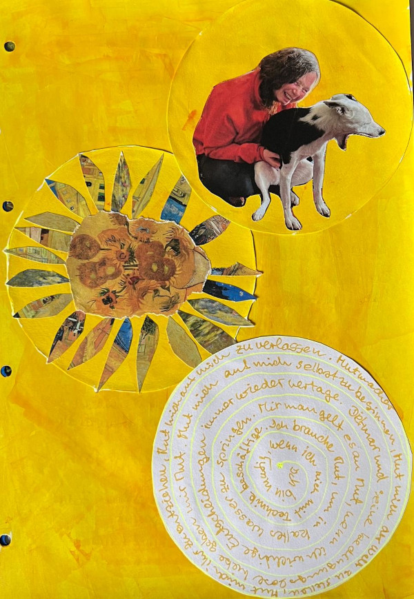 Um die Kreise herum in kurzen Sätzen niederschreiben, was die Collagen an Gedanken hervorrufen.