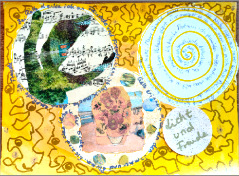 Für den zweiten Kreis eine Mini-Collage mit den Bildern der Impressionisten und in den dritten Kreis eine Mini-Collage mit Bildern aus Zeitschriften anfertigen lassen. Dabei geht es darum auszudrücken, was die Farbe Gelb für jeden einzelnen/jede einzelne persönlich bedeutet.