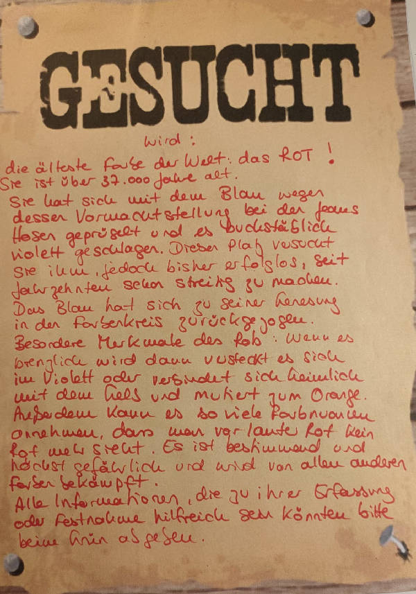 • Auf der linken Seite des Heftes eine Collage mit diesen Bildelementen gestalten. Wörter, die auf die Bedeutung des Rots hinweisen, oder Redewendungen zum Rot in die Collage kleben und/oder schreiben (60‘). Sich die Collage noch einmal aufmerksam anschauen und dann eine kreative Schreibarbeit (30‘) Es handelt sich um eine Bekanntmachung.