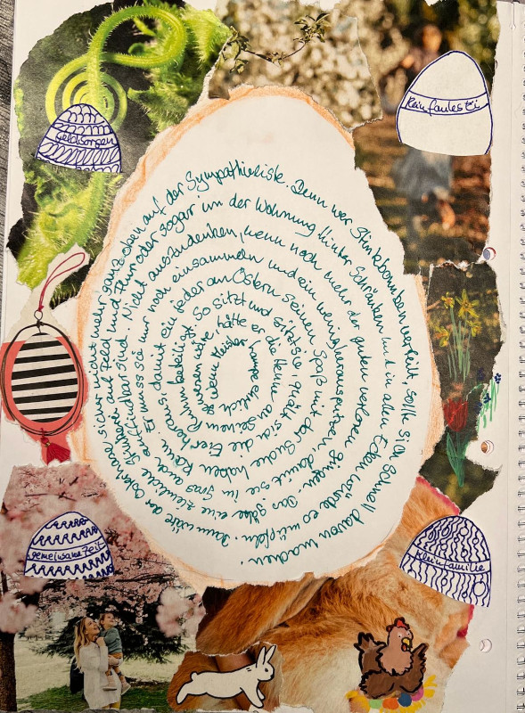 S=Schweigen/Stille, ich rede nicht während des kreativen Arbeitens und höre in mich hinein, lausche meinen Geschichten. - Ein großes Ei in die Mitte der Seite zeichnen. In diesem Ei von innen nach außen zirkulär entweder den folgenden Satz ergänzen lassen: Ostern bedeutet für mich …oder einen etwas längeren Text schreiben lassen, der mit: Wenn Meister Lampe das gewusst hätte, dann … beginnt. (20‘)