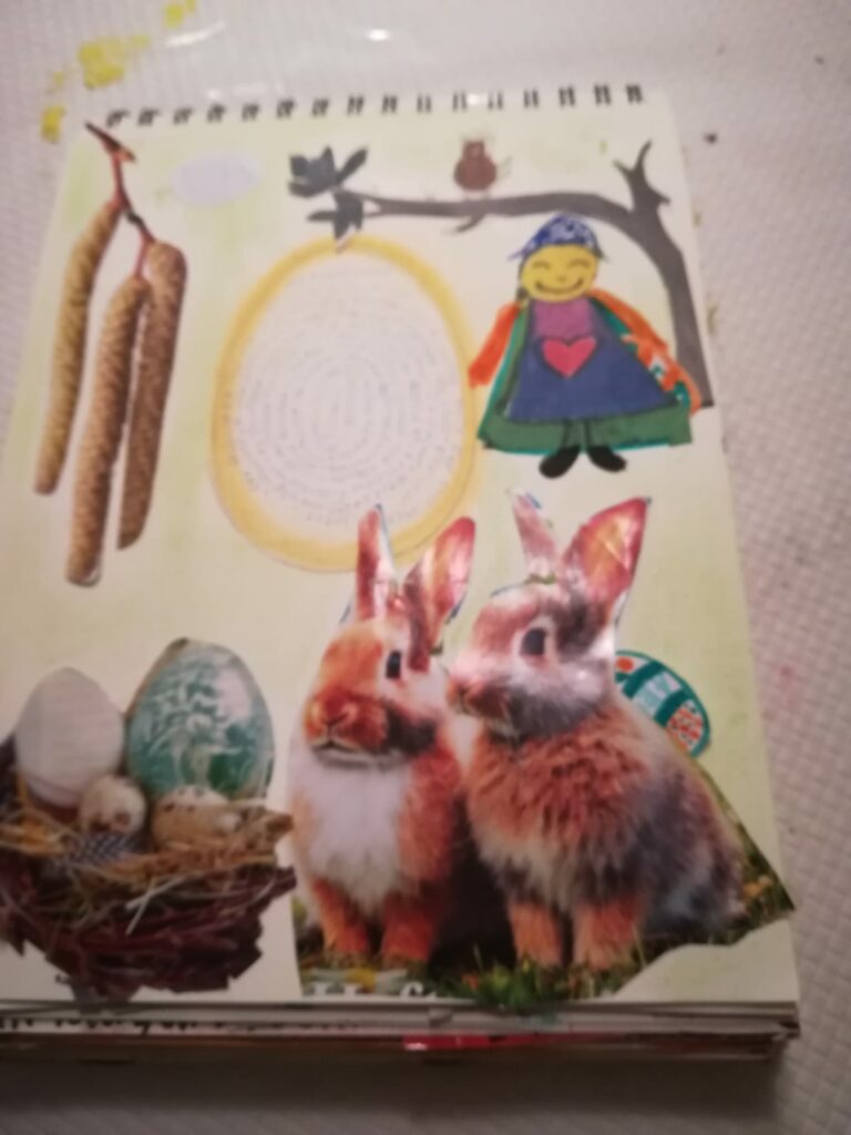 - Die Seite mit Bildern aus Zeitschriften oder Zeichnungen ergänzen lassen. Alles, was man mit Ostern verbindet. Man kann dafür die Schablonen von Hasen anfertigen lassen, sie auf Bilder aus Zeitschriften abzeichnen, ausschneiden und auf das Blatt kleben. (30‘)