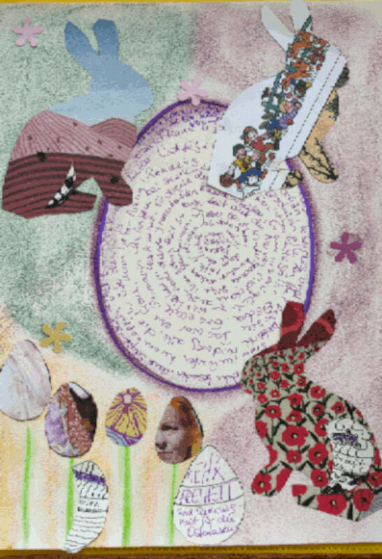 Sich die Sätze noch einmal durchlesen, in die Collage geistig eintauchen und alles in einem Wort zusammenfassen; ein Wort festhalten, das uns spontan in den Sinn kommt. Das Wort auf das vierte Ei schreiben. Das synthetische Zusammenfassen am Ende erlaubt es sich der Botschaft, die uns unsere kreative Arbeit geschickt hat, noch einmal ganz bewusst zu werden, um sie vielleicht in unser Alltagsleben mitnehmen zu können. (10’)