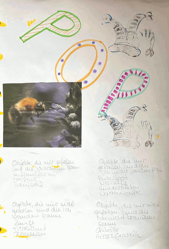• Als Einstiegsübung: Das Wort POP in Großbuchstaben auf eine Seite schreiben. Ein Bild aus einer Zeitschrift herausschneiden, das wir mit dem Wort Pop verbinden und irgendwohin auf die Seite kleben. In Kleingruppen von drei Personen sich kurz über die Bedeutung dieses Wortes und die Auswahl des Bildes austauschen (2 Minuten Maximum für jede Person) (insgesamt 20‘)