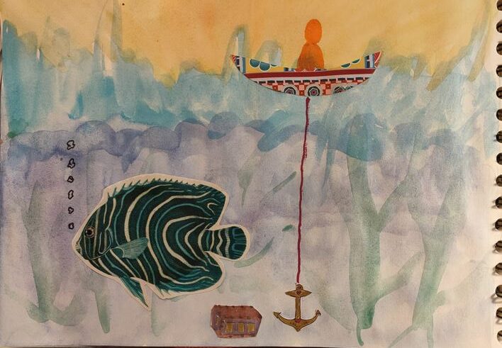 - Auf der linken Seite des Kreativen Tagebuchs ein kleines Boot auf dem Wasser zeichnen lassen mit einer kleinen Figur darin und den Anker mit einer Leine bis auf den Meeresgrund hinuntergleiten lassen. Eine kleine Kiste daneben zeichnen oder als Collageelement draufkleben lassen.