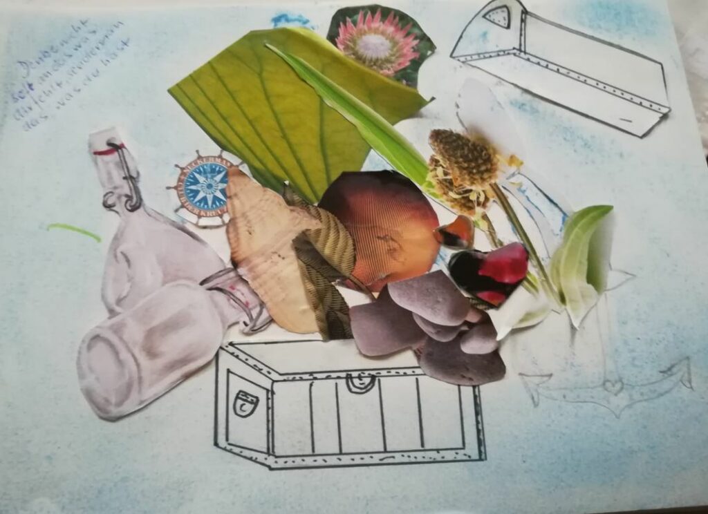 - Als Option kann man auch noch eine kurze Schreibarbeit erstellen lassen. Eine Reflexion über die Collage. Der Satzbeginn könnte folgendermaßen lauten: Wenn ich meine Schatzkiste anschaue, dann …